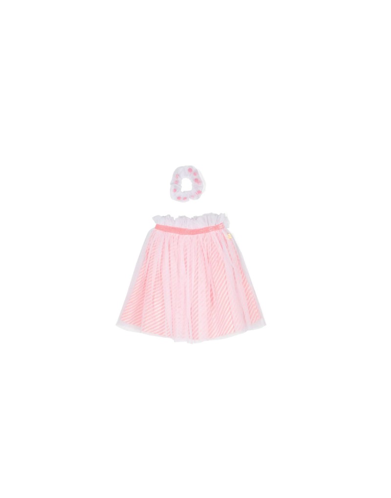 Falda niña Billieblush de tul estilo acampanado con forro interior a rayas blancas y rosas en diagonal. Cintura elástica brillante rosa decorada con purpurina. Tejido forro: 100% algodón. Tejido tul: 100% poliéster.