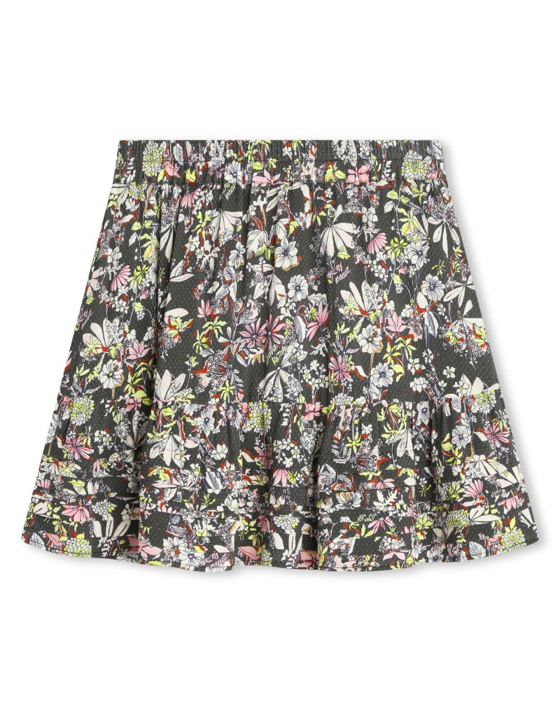 Falda negra de Zadig & Voltaire con estampado floral en tonos beige, lila, rosa, rojo y amarillo y pliegues en la parte inferior. La cintura dispone de una cinta elástica para facilitar su adaptación al cuerpo de cada niña.