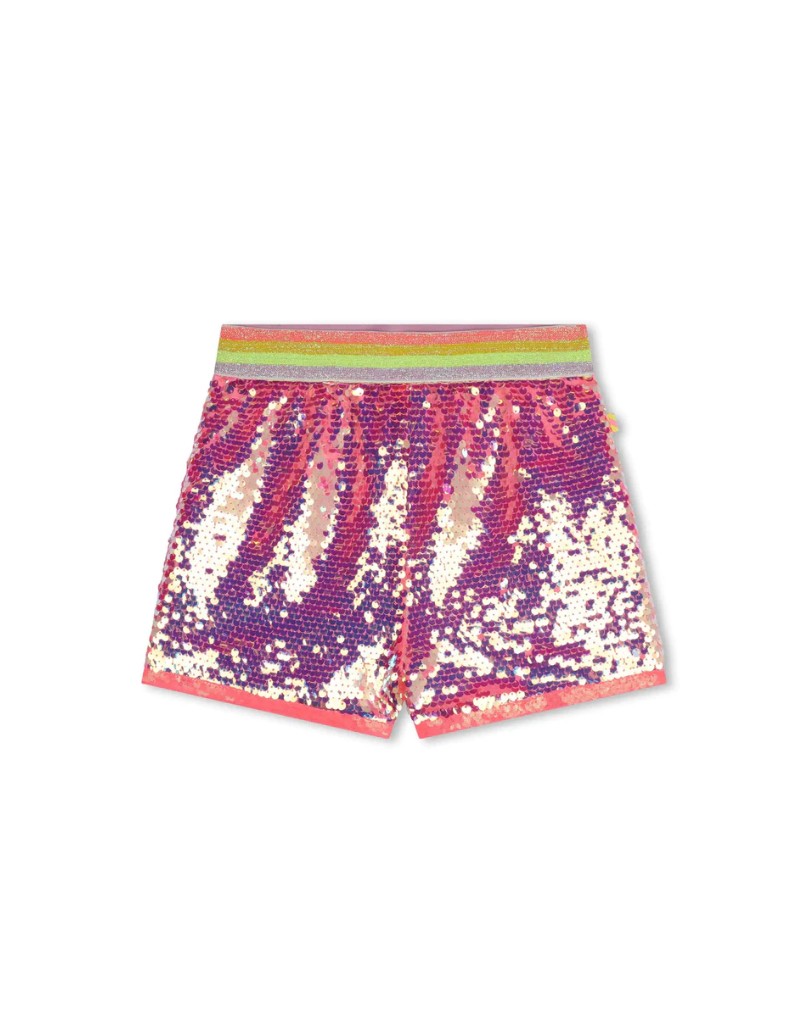 Short deportivo para niña de Billieblush. El short esta recubierto de lentejuelas y dispone de una cinta elástica en la parte superior para ajustarse mejor a cada cuerpo. La cinta elástica es de rayas horizontales de colores rosa, naranja, amarillo y lila todos con un toque metalizado. Tejido: 100% poliéster. Incluye una corona rosa con purpurina.