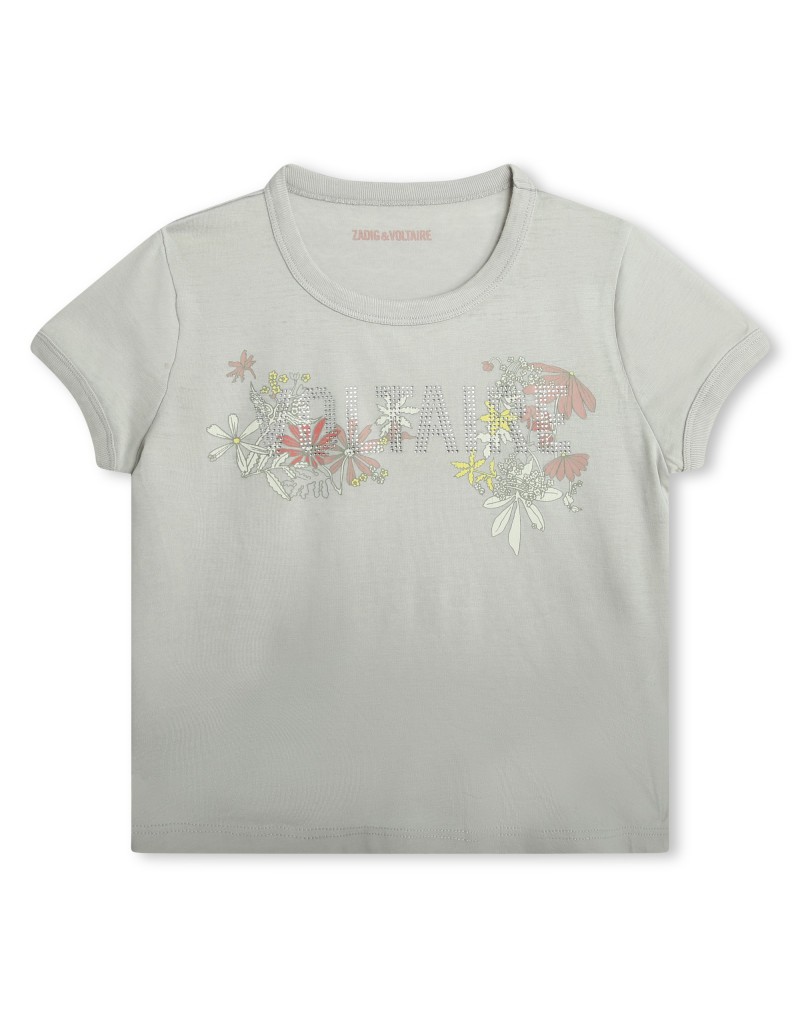 Camiseta de manga corta con cuello redondo en color beige de Zadig & Voltaire. Dispone de un estampado en la parte delantera con la palabra "Voltaire" hecha con pequeñas tachuelas plateadas y decorada con flores.