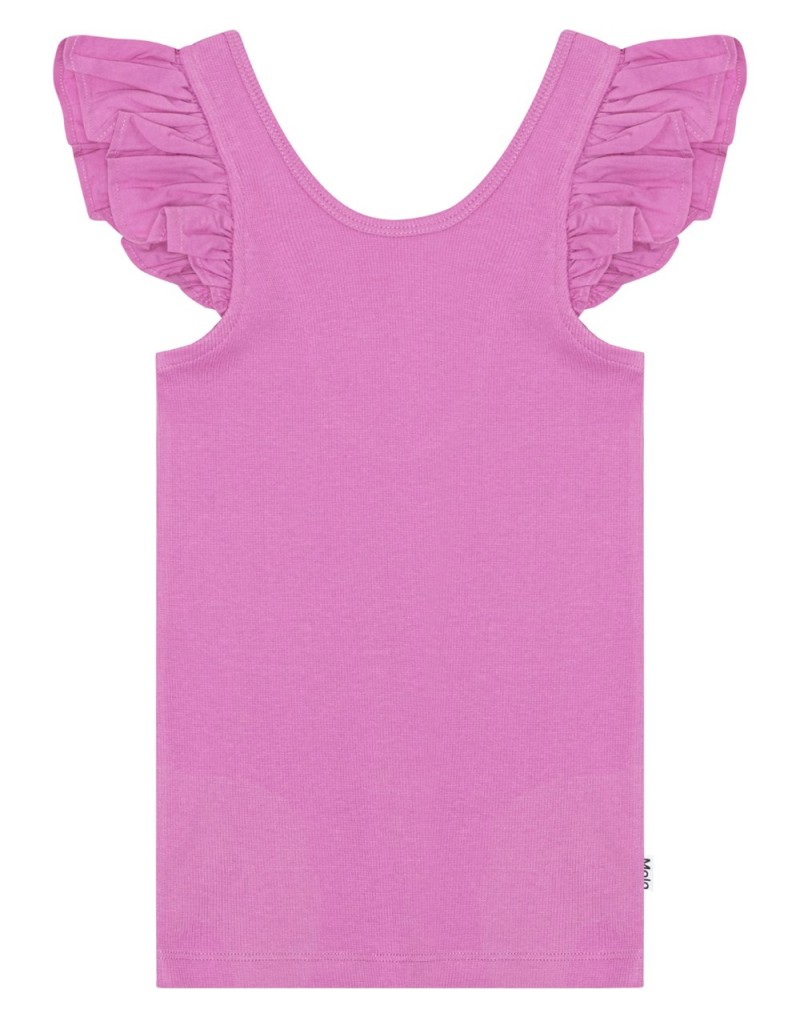 Camiseta Molo sin mangas en color rosa. Es de corte ceñido y tiene un volante de popelina en los hombros. Tejido: 100% algodón orgánico.