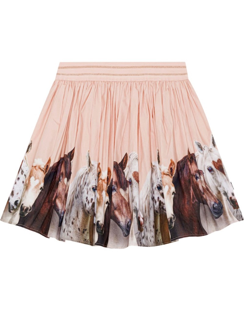 Falda color polvo en algodón orgánico. La cintura elástica, que dispone de dos rayas de purpurina, es cómoda y fácil de poner y quitar. Hay un estampado de caballos en tonos marrones y blancos que recorre toda la falda.