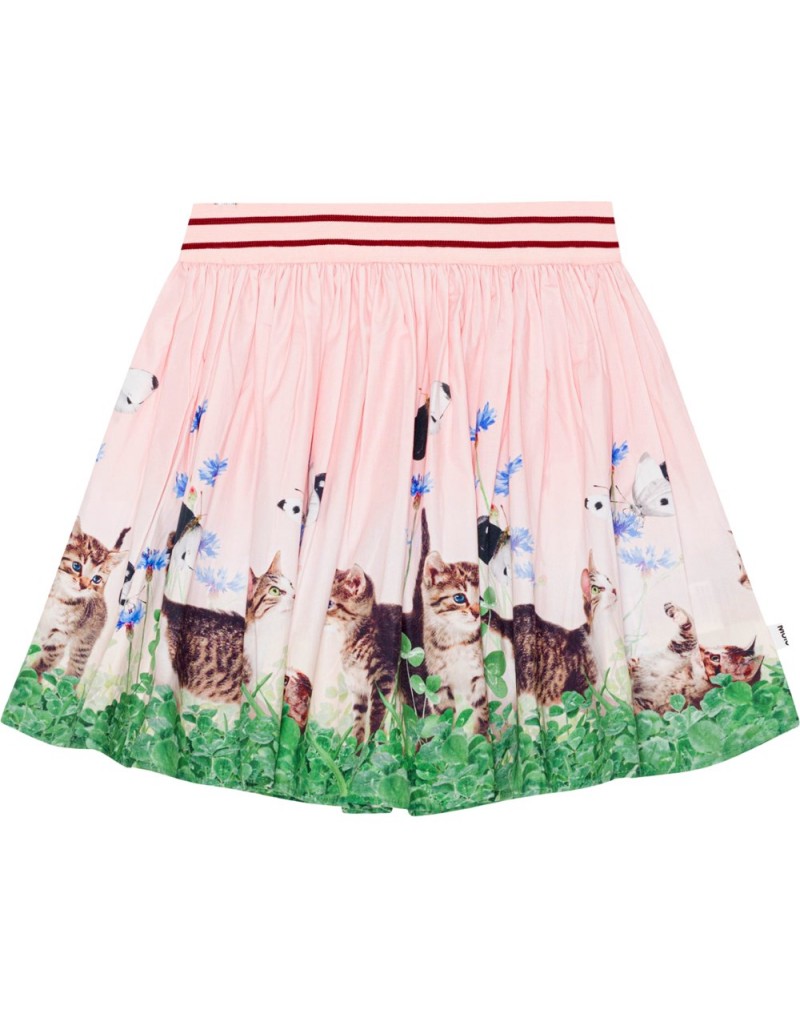 Falda en color rosa pastel en popelina ligera y hecha de algodón orgánico. La cintura elástica, que dispone de dos rayas en color granate, es cómoda y fácil de poner y quitar. Hay un estampado de juguetones gatitos sobre césped y flores azules que recorre toda la falda.