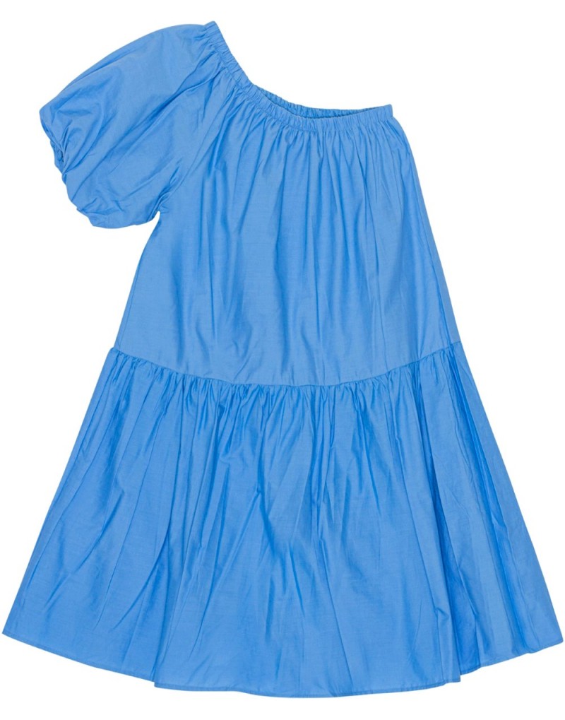 Vestido azul de un solo hombro confeccionado en algodón orgánico. La parte superior del vestido tiene un hombro descubierto con elástico y una manga abullonada en el lado derecho. Llega hasta la rodilla y la falda fruncida le da mucho volumen. El vestido es fácil de llevar y muy cómodo.