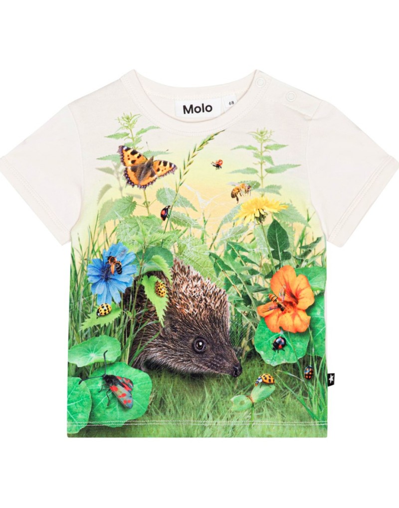 Camiseta de bebé en color blanco roto hecha de algodón orgánico. La camiseta tiene un ajuste ceñido, una cinta de borde estrecho en las mangas y el cuello y un cierre sencillo con dos botones a presión en el hombro izquierdo. La camiseta tiene un estampado en la parte delantera de un dulce puercoespín e insectos en la hierba verde.