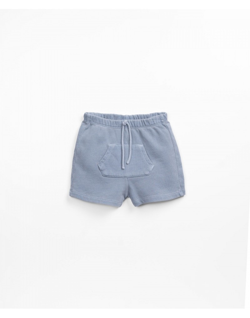 Este pantalón corto está confeccionado con punto mezcla de algodón orgánico y algodón, en color azul. Es un modelo con cintura elástica y cordón de adorno, tiene un bolsillo canguro en la parte frontal.
